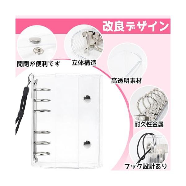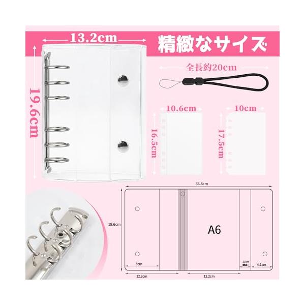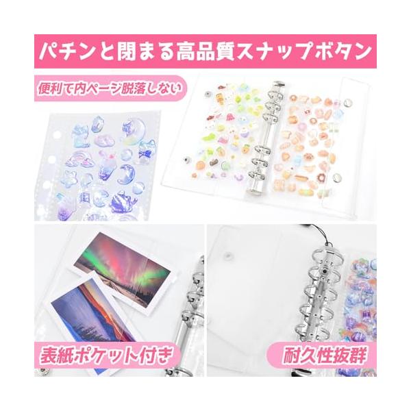 ・【高透明クリア素材で中身がよく見える】A6サイズのシールバインダーは高透明度の素材を採用。収納したシールやカードがくっきり見え、カバー内側のポケットで中身が一目瞭然。雨の日や鞄の中でも汚れを寄せ付けず、毎日持ち歩くのに最適な耐久性。しっかりした6穴バインダー仕様でページの固定を安心。透明シール帳としても、クリアバインダーとしても、かわいいシール収納を安全に保管できます。