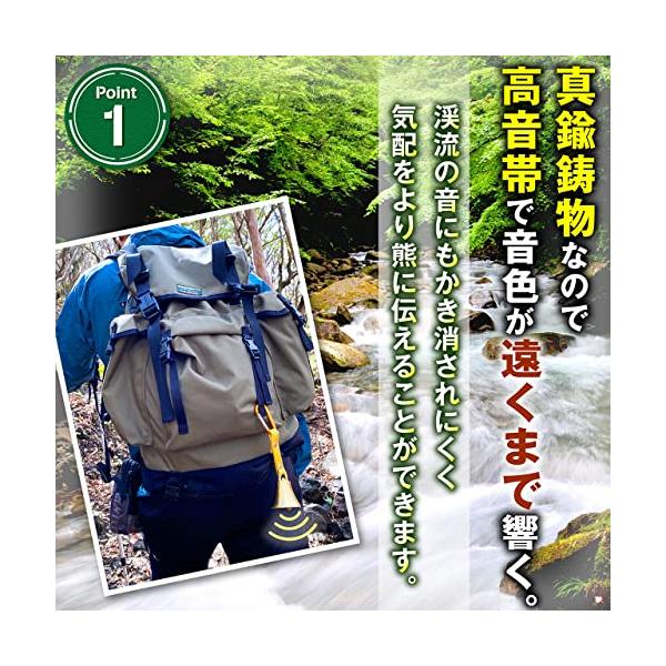 ・真鍮鋳物なので高音帯の音色が遠くまで響きます。 渓流の音にかき消されにくく、より遠くまで響く効果があります。 より遠くの熊に存在を知らせることが可能になります。