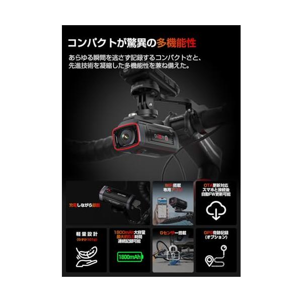 ・【IP66相当・1800mAhバッテリー内蔵・最大5.5H連続記録】 IP66等級の防水防塵機能を搭載し、水しぶきや塵埃から内部機構を保護しつつ、