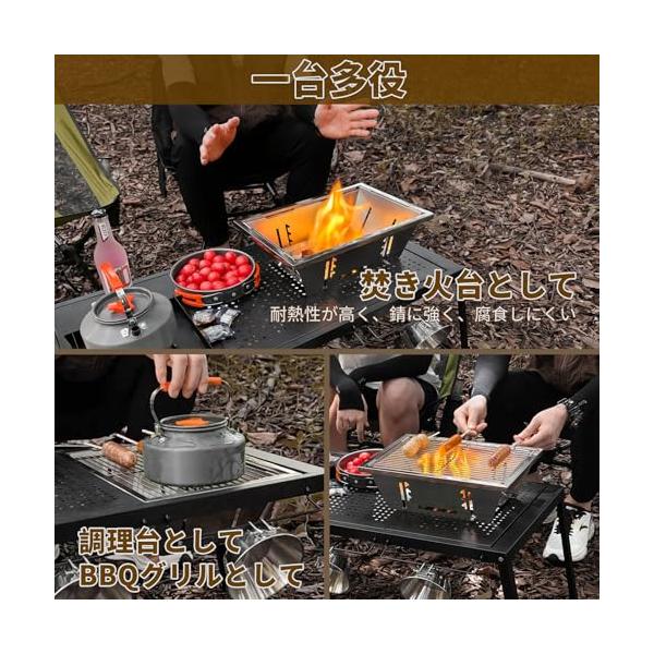 ・?【1台で3役・調節可能】コンパクトなコンロでありながらも、たくさんの使い方法があります。バーベキューグリルや焚火台、調理台としても使用可能です。付属の