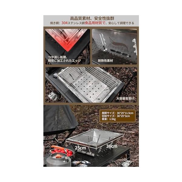 ・?【高い燃焼効率】この卓上グリルは四面防風デザインでしっかりと風よけできるので、風の心配なく調理できます。底面と側面には換気専用の穴があり、良好な換気性を確保し、燃焼効率を高めます。また、ロストル部分は取り外し可能で水洗いもでき、片付けが便利です。