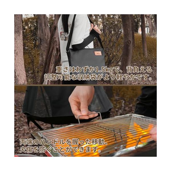 ・?【3段階の高さ調整】:2本のステンレス調整棒が付属しており、専用のガイドレールに固定できます。使用時に、異なる食材の温度に応じて高さを調整することができ、炭の節約と焼き時間の短縮が可能です。◆【両端のハンドルデザイン】両端のハンドルを握った移動、火傷を防ぐことができます、アウトドアでの使用時に移動が便利です。