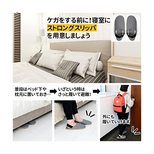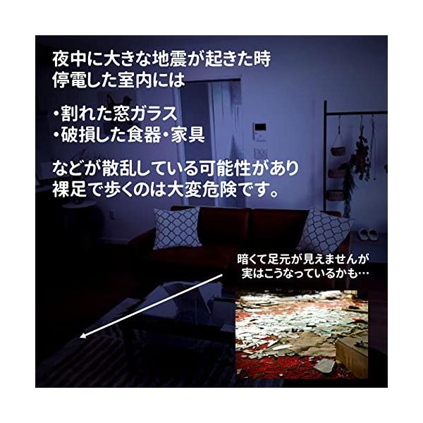 ・【防災スリッパ備えてますか?】地震の後など室内に散らばる割れたガラスや屋外の瓦礫などから足を守る防災スリッパ。脚裏は釘なども貫通しない素材でできているので、枕元に備えておけば、暗くて足元が見えない夜間でも安心です。