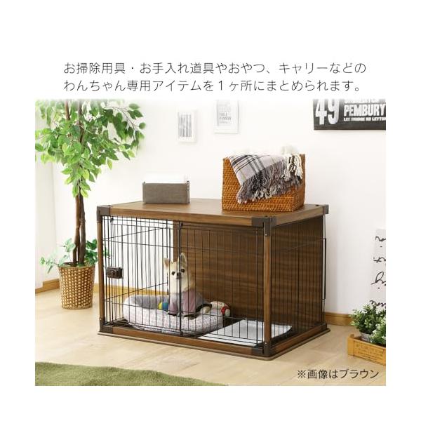 ・【商品説明】:わんちゃんのやすらぎ空間を考えたサークルです。 屋根と背面のパネルが穴ぐらのような空間を演出。 温かみのある木目調のデザインで、インテリアに調和します。 天板には物を置くことができるので わんちゃん専用アイテムを1か所にまとめて置いておけます。 入口は、スムーズに開閉できるスライド式。 ロックをつまんでスライドするだけで、スムーズに開閉できます。 プラスチック製トレーは、水で丸洗いが可能。 組み立ては、サークルの四隅に固定ピンをさしこむだけ。 簡単に組み立てることができます。 ※お客様組立て