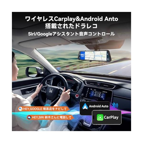 ・【CarPlay/Android Auto & GPSナビゲーション&音声コントロール】M CARKUMI ドライブレコーダーミラー型はCarPlayとAndroid Autoをサポートしており、CarPlay/Android Autoを接続して、スマートフォンの機能を車内で手軽に楽しめます。スマホのナビを直接ご利用できて、なんかの更新の手続きは不要、いつでもどもでも最新のナビ地図を提供できます。Siri/Google アシスタントを使用して、タッチせずに音声制御を行うことができ、指示を与えるだけで、電話に応答したり、音楽を再生したり、ナビゲーションを使用したりできます。運転中に手を解放し、安全かつ快適な運転体験をもたらします。初回接続すると、次回は自動的にCarplay/AndroidAutoを繋げます。