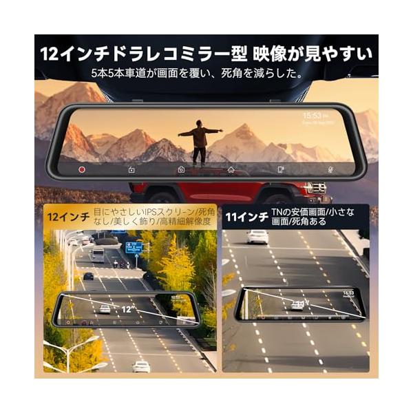 ドライブレコーダー ミラー型 4K【Carplay & Android Auto】 12インチ ドラレコ 前後カメラ 64GBメモリカード付属