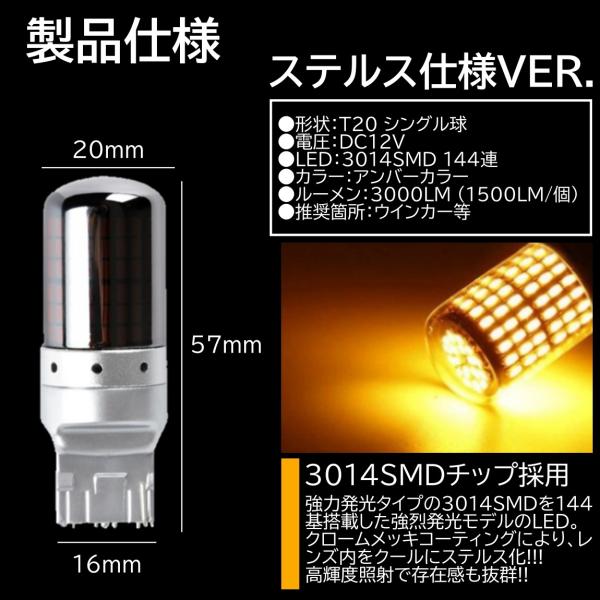 144連 高輝度ステルスウインカー LED T20 シングル S25 150度 180度 LEDウインカー アンバー ハイフラ防止抵抗内蔵 ピンチ部違い対応 2個