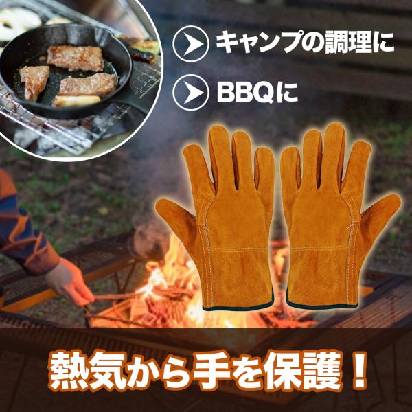 キャンプやバーベキューの必需品となる耐熱・耐火に優れた牛革製のキャンプグローブ