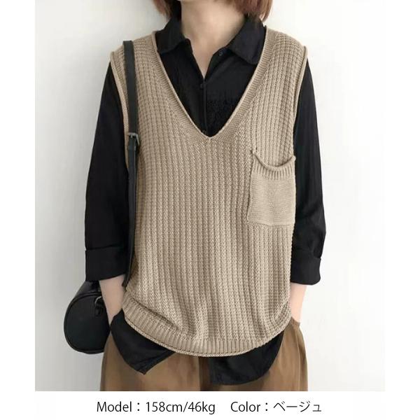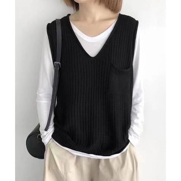 ポケット付きニットジレ ノースリーブ ニットトップス 重ね着 ベストセーター 薄手 体型カバー 20代30代