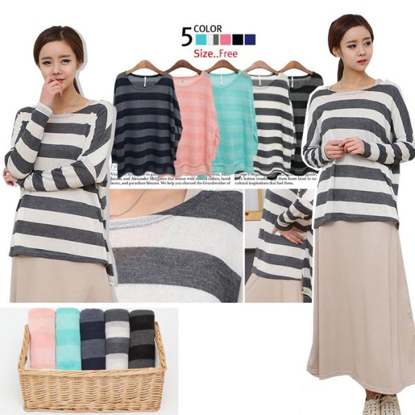 ボーダー柄☆横スリット&バックロングゆったり長袖ドルマンカットソー/アシンメトリー【メール便送料無料】