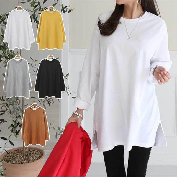 シンプルラウンドネックゆったりルーズシルエット♪スリット入りロング丈長袖Tシャツカットソー/薄手 無地【メール便送料無料】