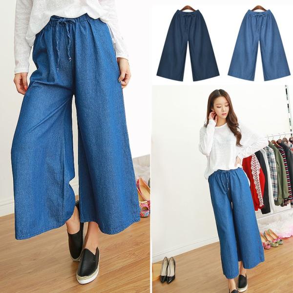 ダンガリーデニム♪フレアガウチョパンツ/ウエストゴム フレアパンツ ワイドパンツ【メール便送料無料】