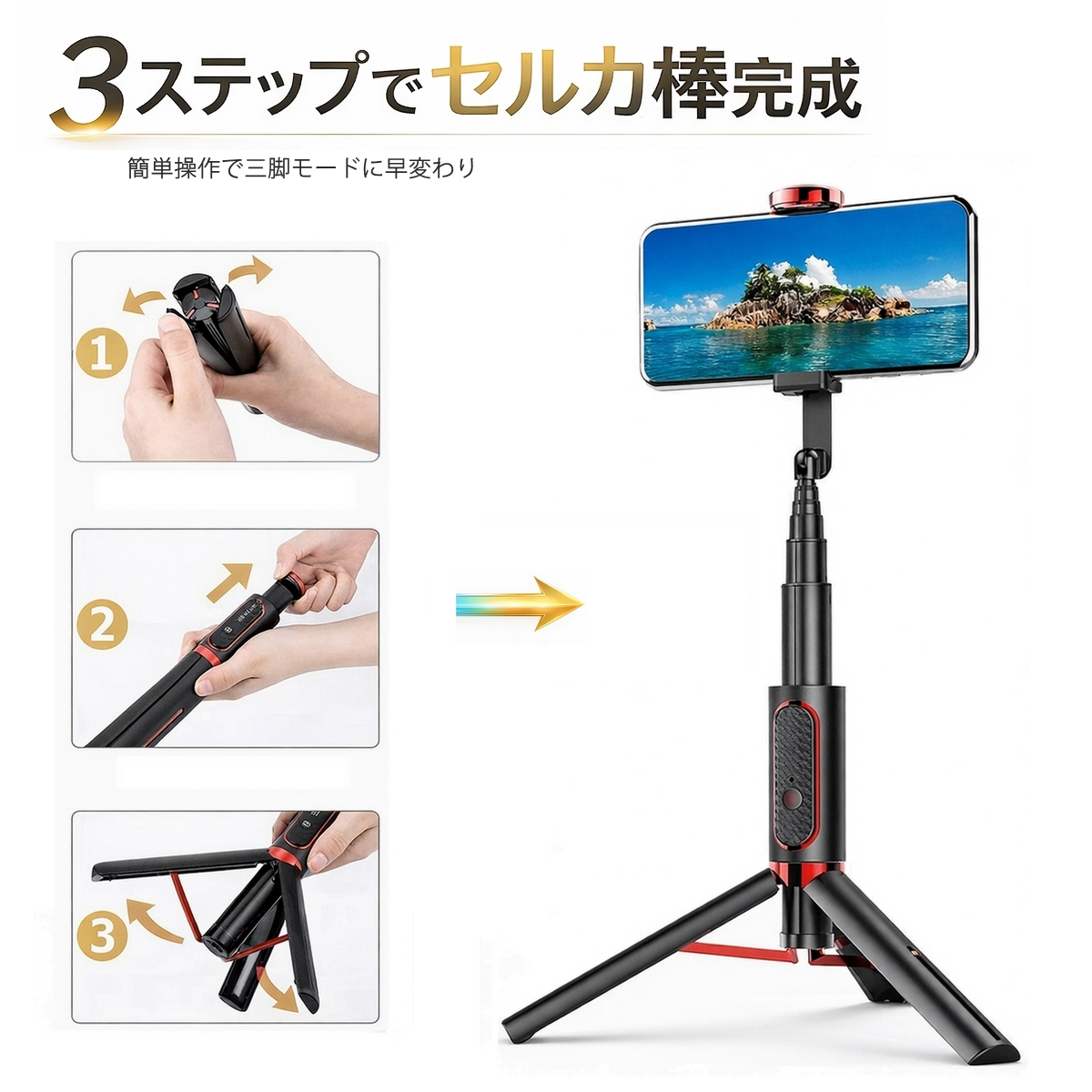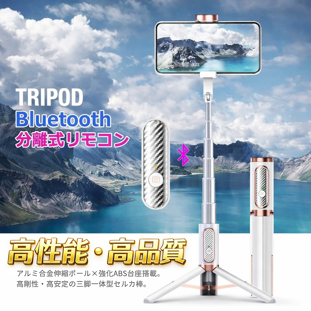 自撮り棒 セルカ棒 三脚付き Bluetoothリモコン付 iPhone17/16/15/14/13/12/11対応 Android対応 折りたたみ 軽量 伸縮式 8段階調節 360度回転 多機能セルフィースティック Vlog動画撮影 ライブ配信対応 安定三脚【宅配コン】