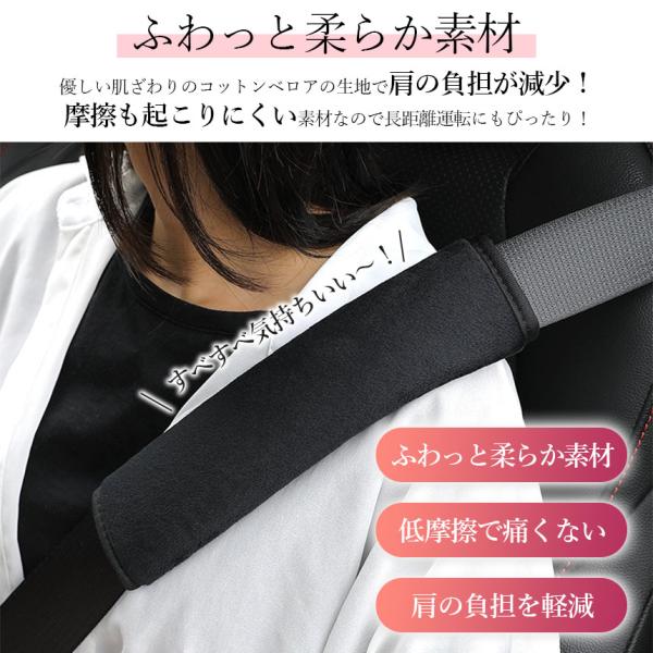 ●肩の負担を軽減●シートベルトをつけている時に肩・首などにかかる負担を軽減!・シートベルトで肌が擦れて痛い・シートベルトで鎖骨が圧迫される・長距離運転で肩が凝るなどのお悩みを解決いたします!【柔らかい素材】コットンベロア素材の柔らかく肌触りも優しい生地です。低摩擦で擦れを防止するので長距離の運転にもぴったり!