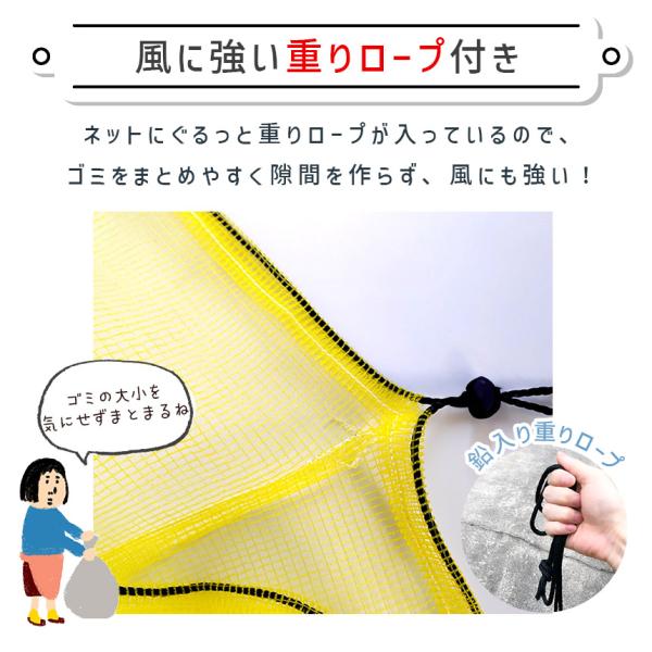●重りロープのカラスよけゴミネット●【カラス被害に】カラスのゴミ荒らしの被害は悲惨、、ゴミをこれでもかとあさって散らかしていきます。一回のみならず、記憶して何度もやってきて、ついには仲間も引き連れて荒らし放題、、そんな被害にあわないように、風に強くしっかりくちばしからも守る、この重りロープ付きのネットで対策を!きっと効果に満足していただけます。【重りロープ】ネットをぐるっと囲むように入っているロープは、鉛を含んでいて、重みがあります。風にも強く、荒らしもしにくい丈夫で安心の素材です。【環境に優しい素材】環境に優しく、無臭、無毒、人体に無害な新しいHDPE素材を採用。引っ張り強度にも優れています。網目は4mmと細かく、くちばしからも守ります。