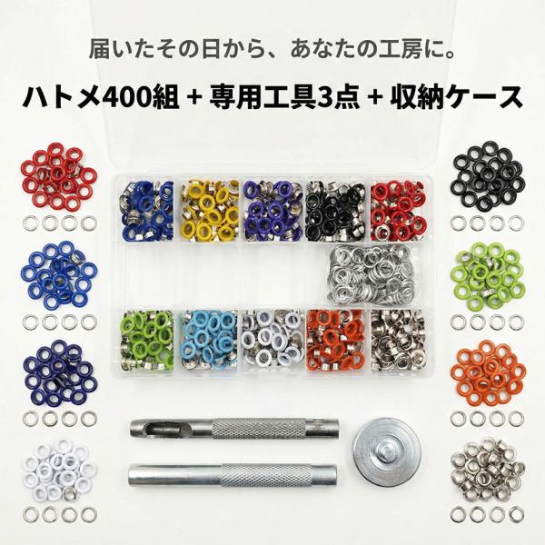 両面ハトメ 5mm 400組セット ハトメパンチ 鳩目 穴あけ 打ち具 工具セット ハトメ 10色 カラフル 大容量 レザークラフト 手芸 DIY ハンドメイド 靴 ベルト バッグ リメイク 金具 パーツ 収納ケース付