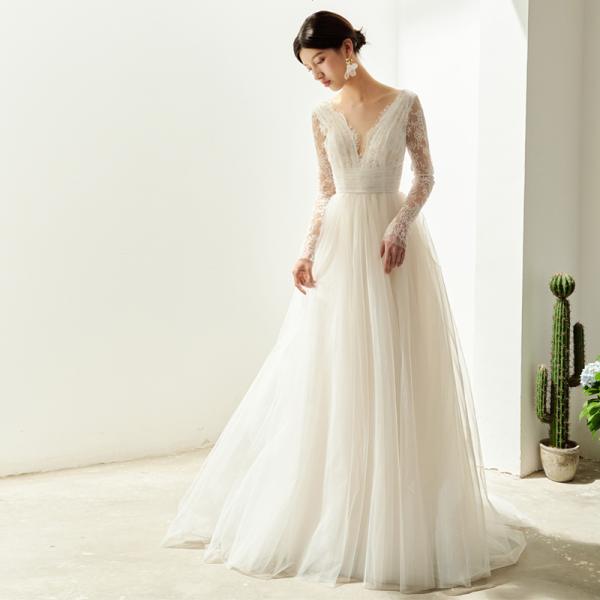 ウェディングドレス ウエディングドレス 二次会 結婚式 披露宴 前撮り 後撮り ブライダル ロングドレス 花嫁 Aラインドレス チュール レース 長袖 ファスナー