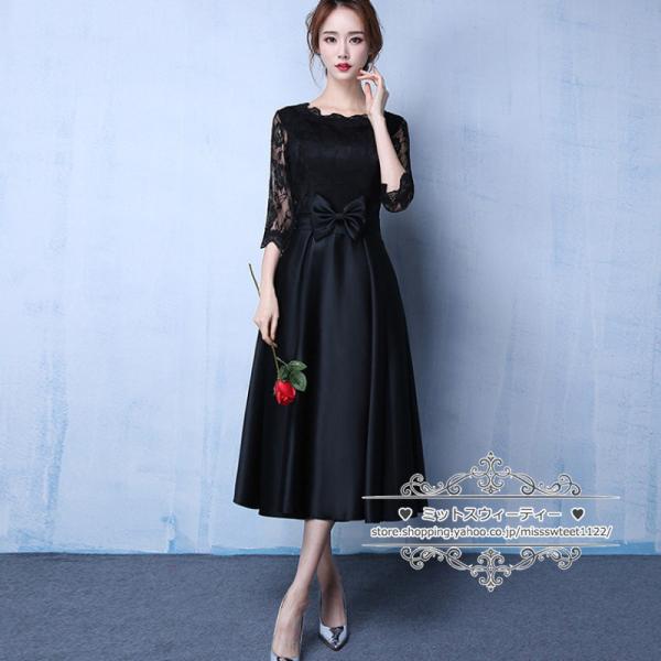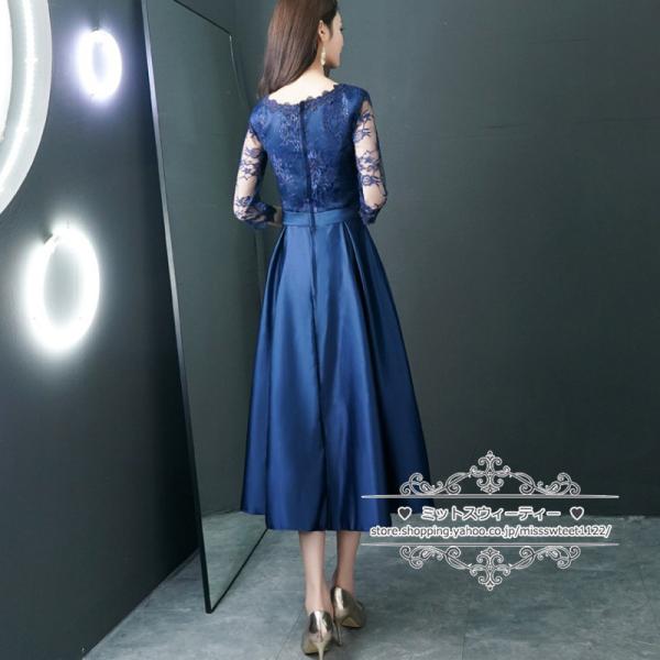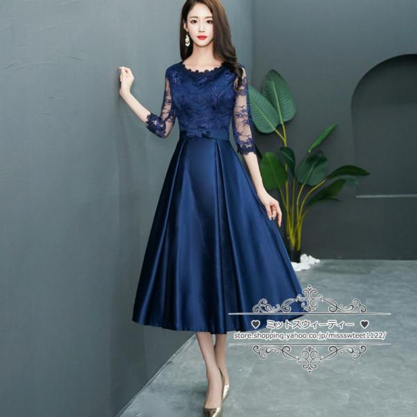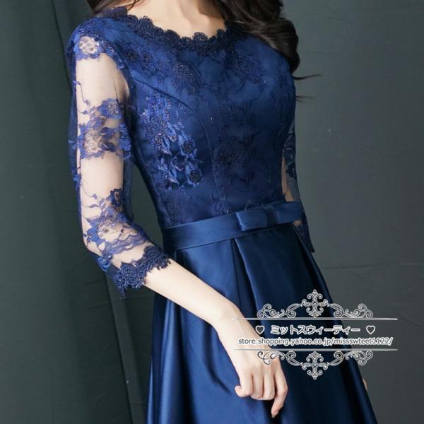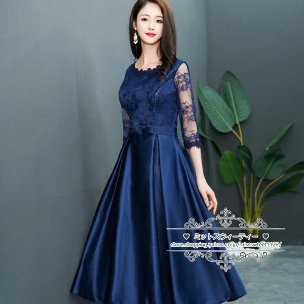 カラードレス ネイビー ブラック カクテルドレス ミディアムドレス パーティードレス 発表会 演奏会 お呼ばれ フォマール Aラインドレス 袖付き レース