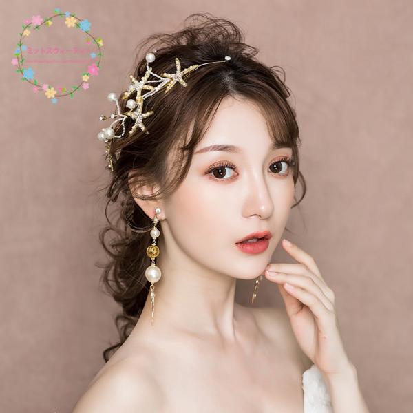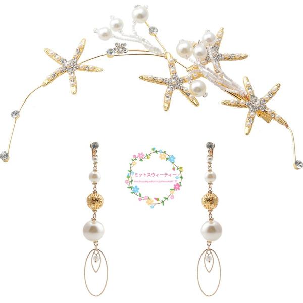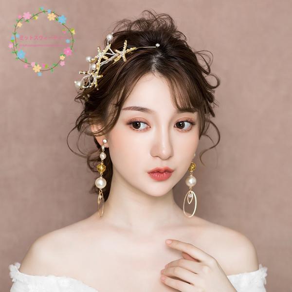 即納 あすつく ウエディング ティアラ 髪飾り 花嫁 ウェディング 結婚式 ヘッドドレス ブライダル パーティー 二次会 ヘアアクセサリー イヤリング 海星 前撮り
