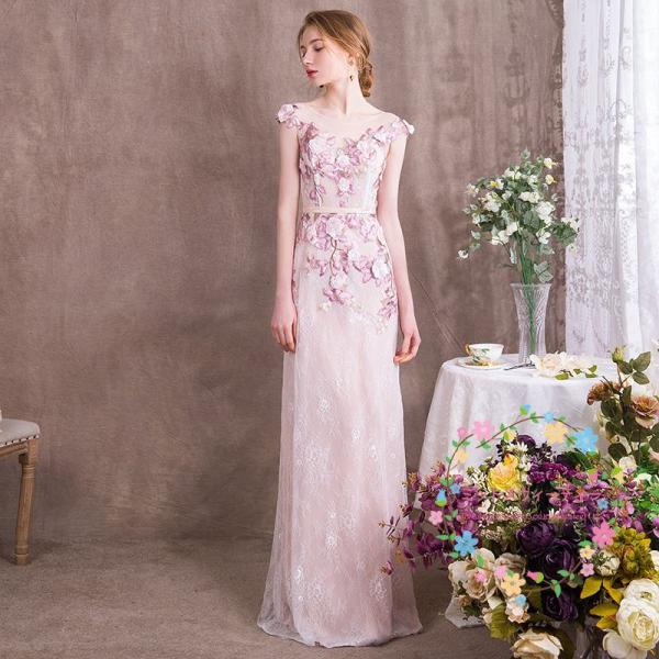 スレンダードレス ロング カラードレス カクテルドレス 花嫁 パーティードレス 演奏会 フォーマル 結婚式 イブニングドレス 二次会 発表会 ピンク 花 エレガンス