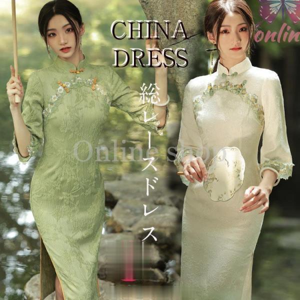 ロングワンピース チャイナドレス 総レース ドレス ワンピース 大人 レディース ロングドレス ハイネック 膝丈 グリーン サイドスリット 5分袖