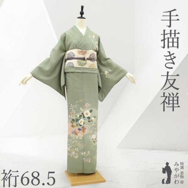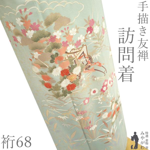 訪問着 着物 未使用 フォーマル 正絹 袷 手描き友禅 薄緑地 四季の花 新古品 仕立て上がり 身丈162 裄丈68.5 Lサイズ みやがわ sb17194