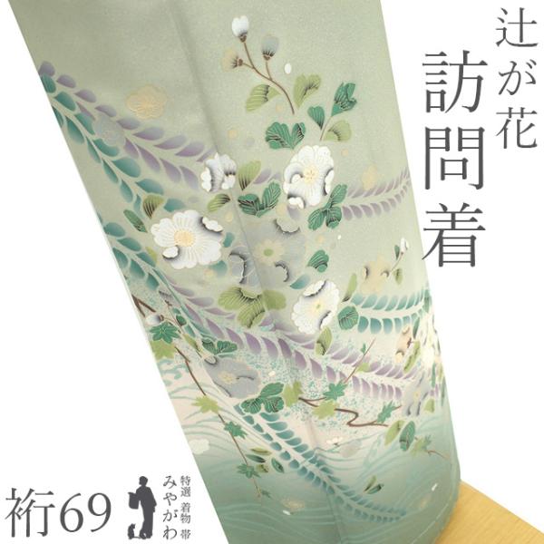 訪問着 着物 未使用 フォーマル 正絹 袷 金彩加工 薄灰緑色 辻が花 波 梅 新古品 仕立て上がり 身丈164 裄丈69 Lサイズ みやがわ sb17272