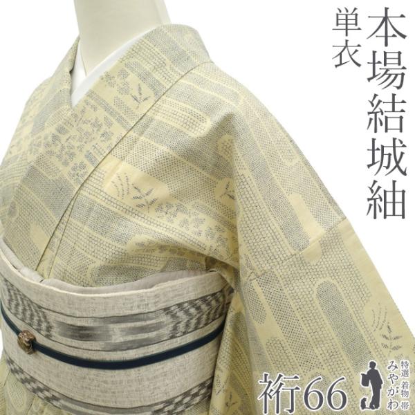 本場結城紬 単衣 着物 未使用 正絹 春 秋 地機 100亀甲 薄黄地 ヱ霞 草花 新古品 仕立て上がり 身丈162 裄丈66 Mサイズ みやがわ sb17281