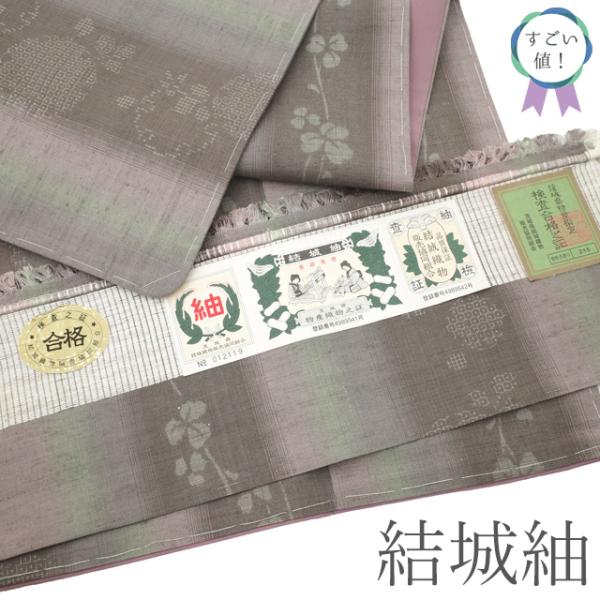 すごい値! 結城紬 未使用 着物 正絹 袷 灰茶 雪輪 草花 縞 80亀甲 美品 上質 新古品 仕立て上がり 身丈155 裄丈64.5 S みやがわ nek01609