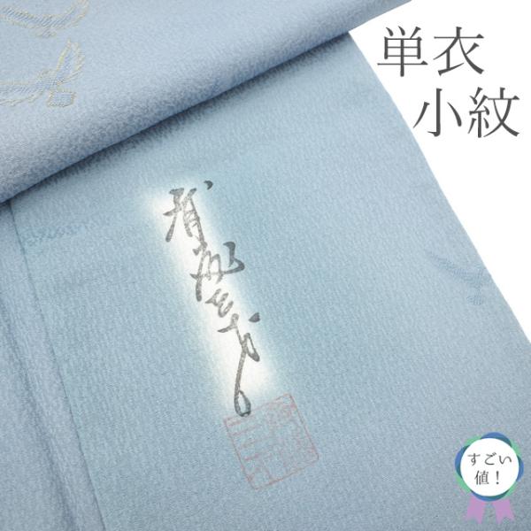すごい値! 小紋 未使用 単衣 着物 正絹 斉藤三才 空色 水色 鳩 春 秋 美品 新古品 仕立て上がり 身丈152 裄63.5 S みやがわ nek01614