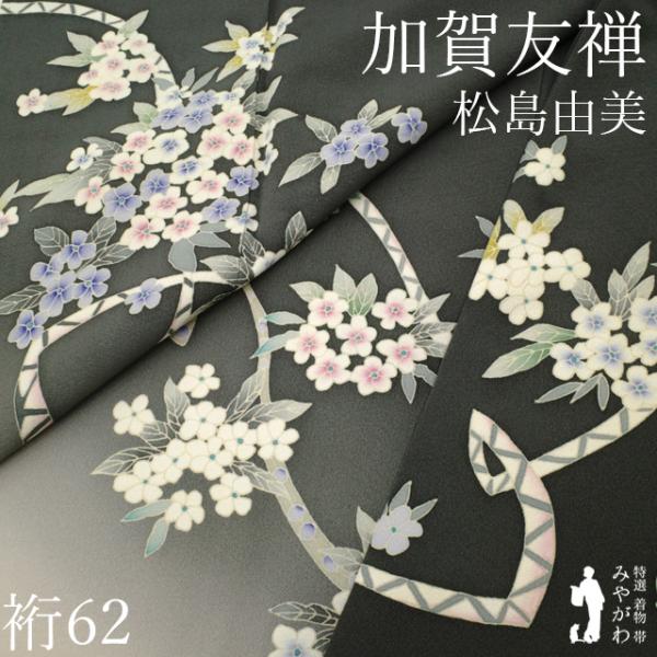 訪問着 着物 未使用 フォーマル 正絹 加賀友禅 松島由美 濃グレー 花 蔓帯 新古品 仕立て上がり 身丈150 裄丈62 Sサイズ みやがわ sb17238