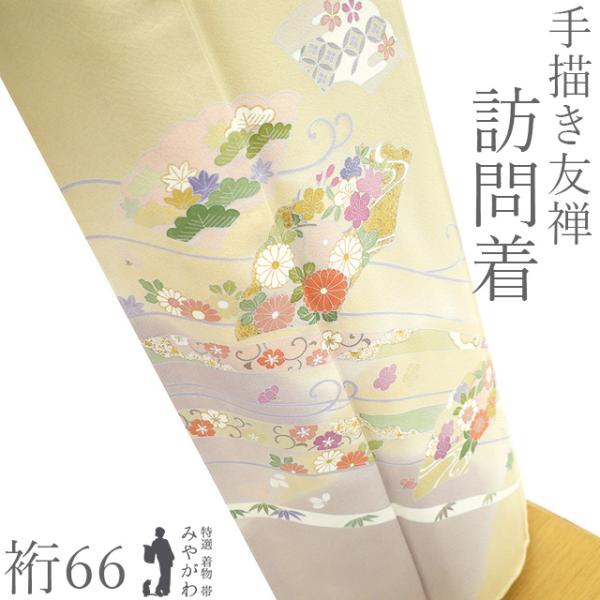 訪問着 着物 未使用 フォーマル 正絹 袷 手描き友禅 薄黄ベージュ 新古品 仕立て上がり 身丈156 裄丈66 S〜Mサイズ みやがわ sb17253