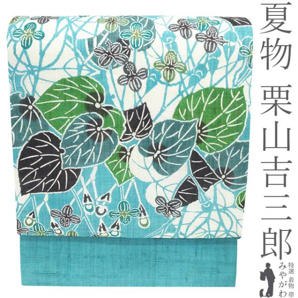 夏物 名古屋帯 未使用 栗山吉三郎 本大麻 和染紅型 麻 水色 秋海棠 シュウカイドウ 人気 カジュアル 新品 仕立て上がり みやがわ sb55307