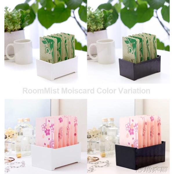 【ルームミスト・モイスカード】サイズ幅147×高さ160×奥行き91mm(組み立て時)容器のカラーアイボリー/ブラックフィルターの種類花桃(はなもも)/草緑(くさみどり)セット内容トレー×1フィルター×7使用期間(目安)約4〜6ヶ月加湿範囲周囲約2m(ルームミスト・モイスカード1個利用の場合。環境によって異なります)備考容器が倒れ、水がパソコンや書類にかからないようご注意ください。フィルターは不織布です。火気に近づけないようにしてください。容器やフィルターに含まれる水は飲まないでください。容器やフィルターは抗菌・防カビ処理済ですが、効果は限定的です。市販のアロマオイル(精油)などはフィルターの揚水機能を妨げるため、ご使用になれません。フィルタ―が汚れた際は、別売りの「ルームミスト・モイスカード専用交換フィルター」をお買い求めください。