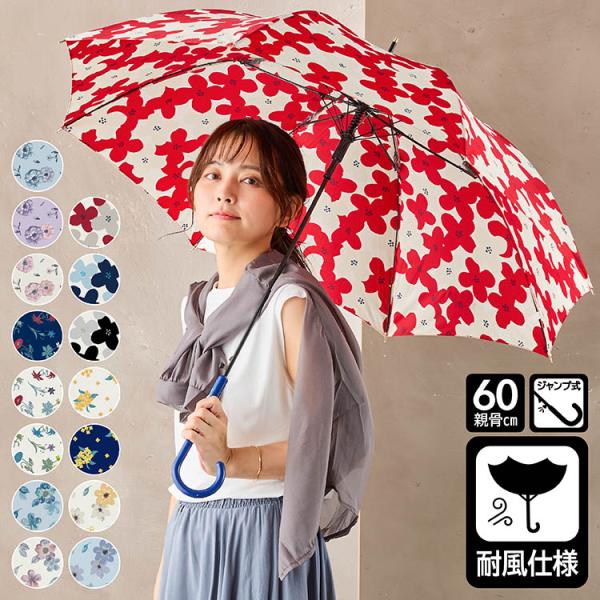 傘 レディース 60cm フラワー 長傘 雨傘 フラワープリント柄 耐風骨 スリムタイプ ジャンプ式 ワンタッチ 軽量 330g