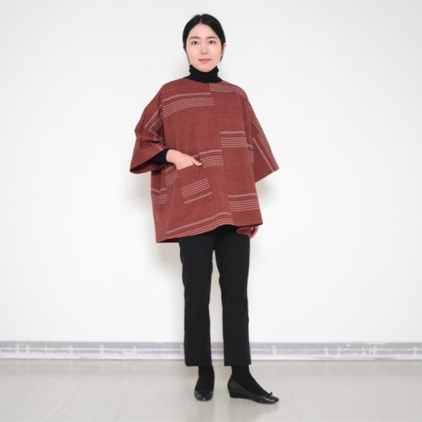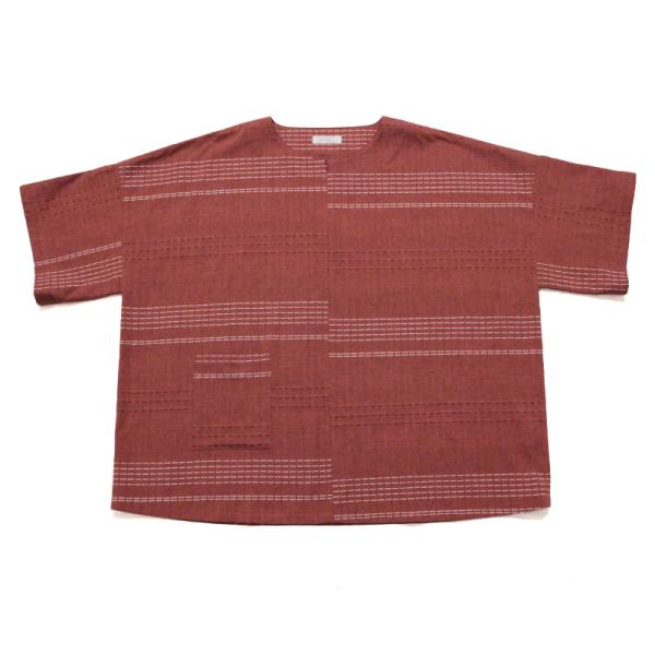 落ち着いた色合いに刺し子が映える、和木綿「三葉(みつば)」を使用したチュニックブラウスができました。