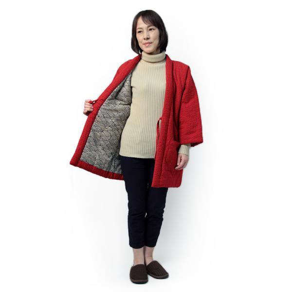木綿織物の老舗、宮田織物がつくるふんわりと柔らかな肌ざわりが特徴のあられはんてんは、裏地に青海波模様を使用するなど贈りものギフトにも好評。