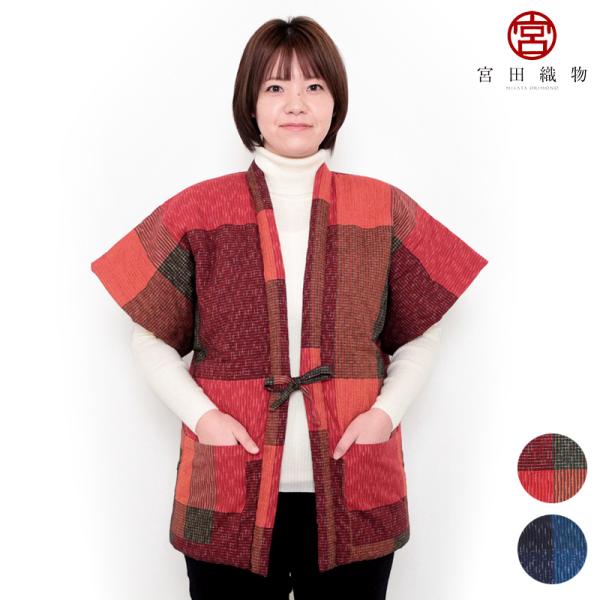 寒さ対策 枇杷やっこ(半袖はんてん) 日本製 宮田織物謹製 袢纏 半纏 メンズ・レディース 綿入り 和モダンシリーズ おしゃれ 赤/ブルー