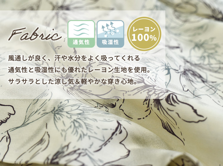 風通しが良く、汗や水分をよく吸ってくれる通気性と吸湿性にも優れたレーヨン生地を使用。