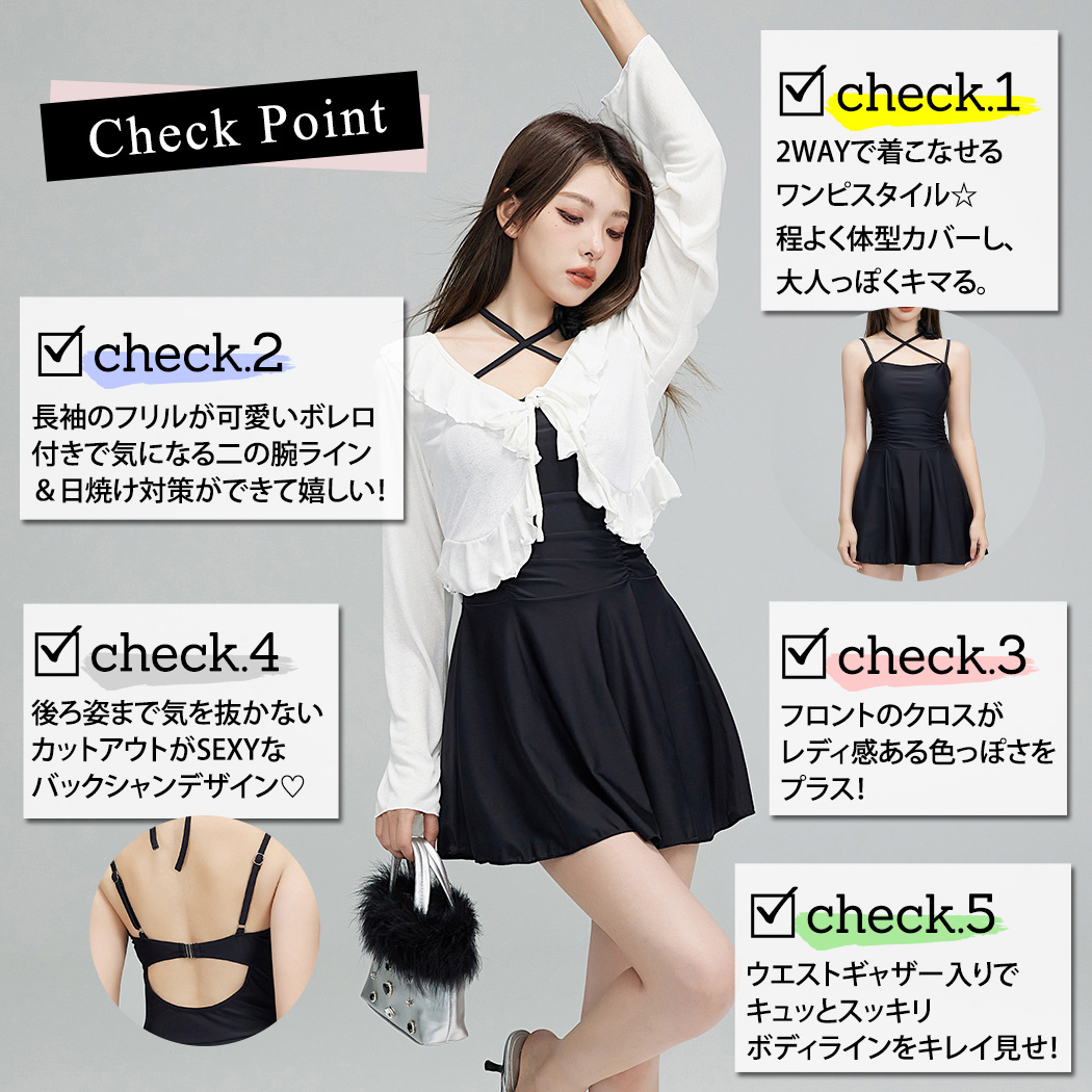 水着 体型カバー ワンピース オールインワン ボレロ 2点セット レディース 2way 長袖 トップス フリル フロントクロス ウエストマーク