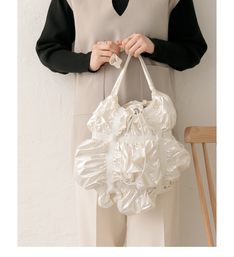 シャーリングによって表現された膨らみ部分がナイロン生地のシワ感と相まって多彩な表情を魅せてくれます。