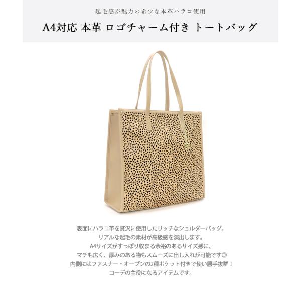 商品名 トートバッグ シンプル 本革 ハラコ レザー A4 A4サイズ対応 レオパード スクエア リッチ アニマル 柄 起毛 大容量 大きめ 上品 お洒落 女性 大人 レディース 秋 冬 BAG チャーム付き