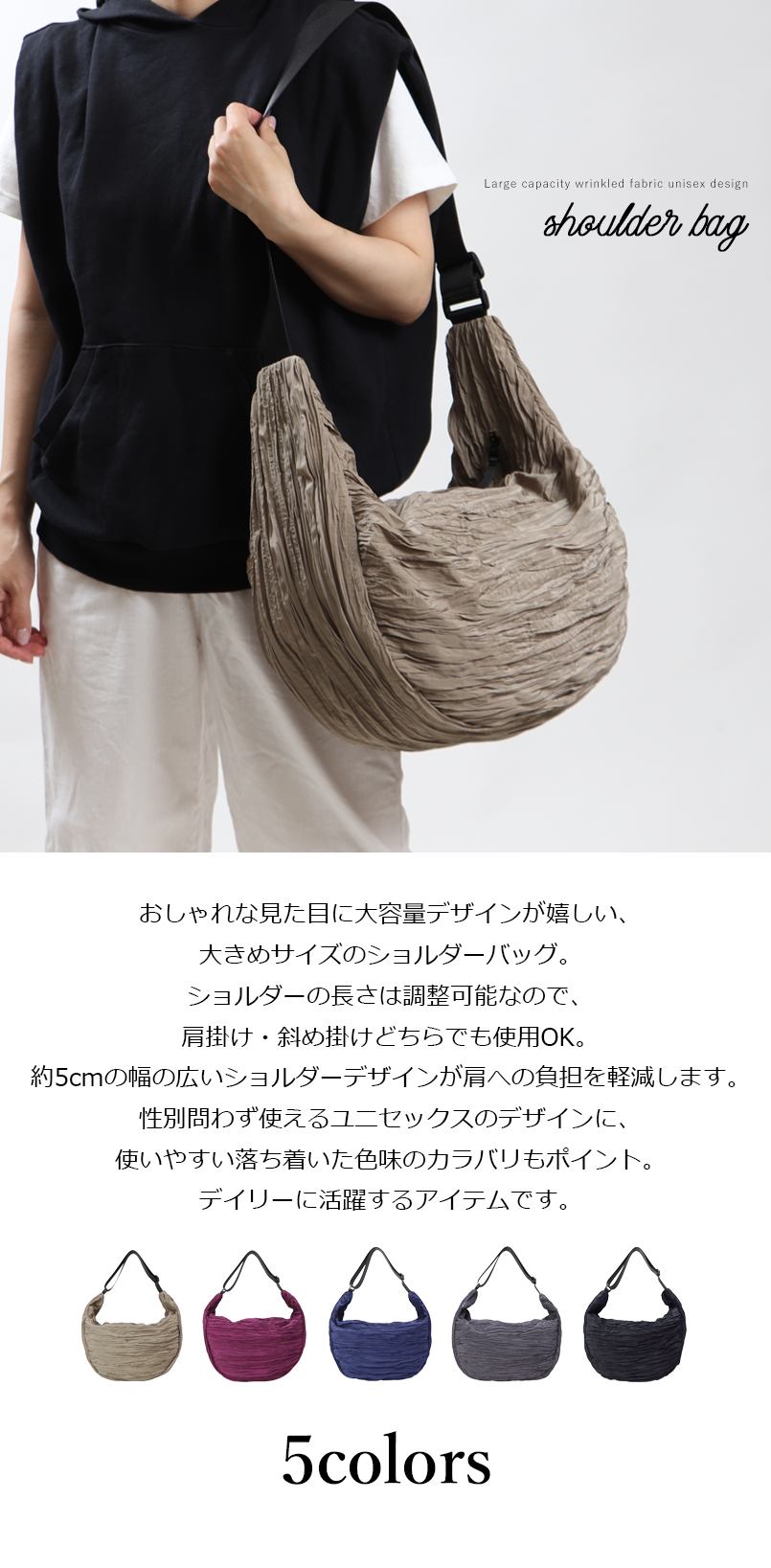 商品名 ショルダーバッグ ショルダー シワ加工 しわしわ 大容量 大きめ 旅行バッグ ユニセックス レディース メンズ 男女兼用 軽量 BAG 収納力 かわいい 肩掛け 斜め掛け 無地 旅行 A4 A4サイズ ママバッグ マザーズバッグ