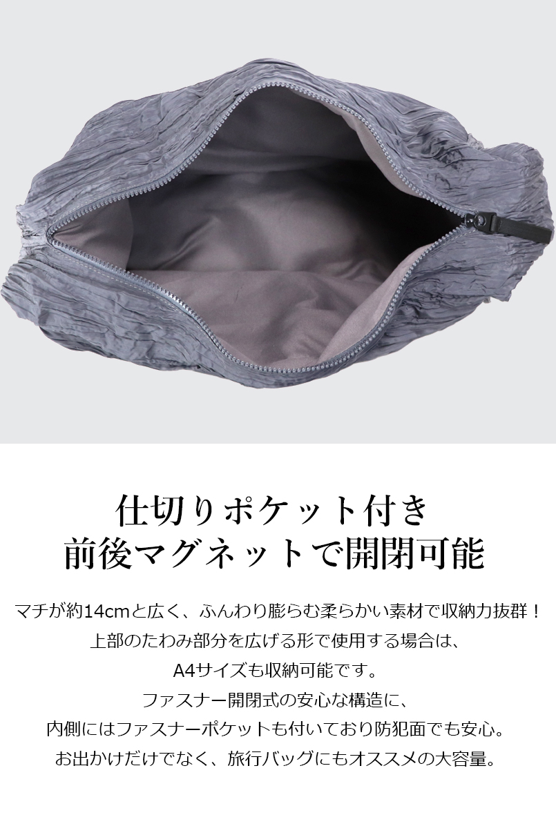 マチが約14cmと広く、ふんわり膨らむ柔らかい素材で収納力抜群!