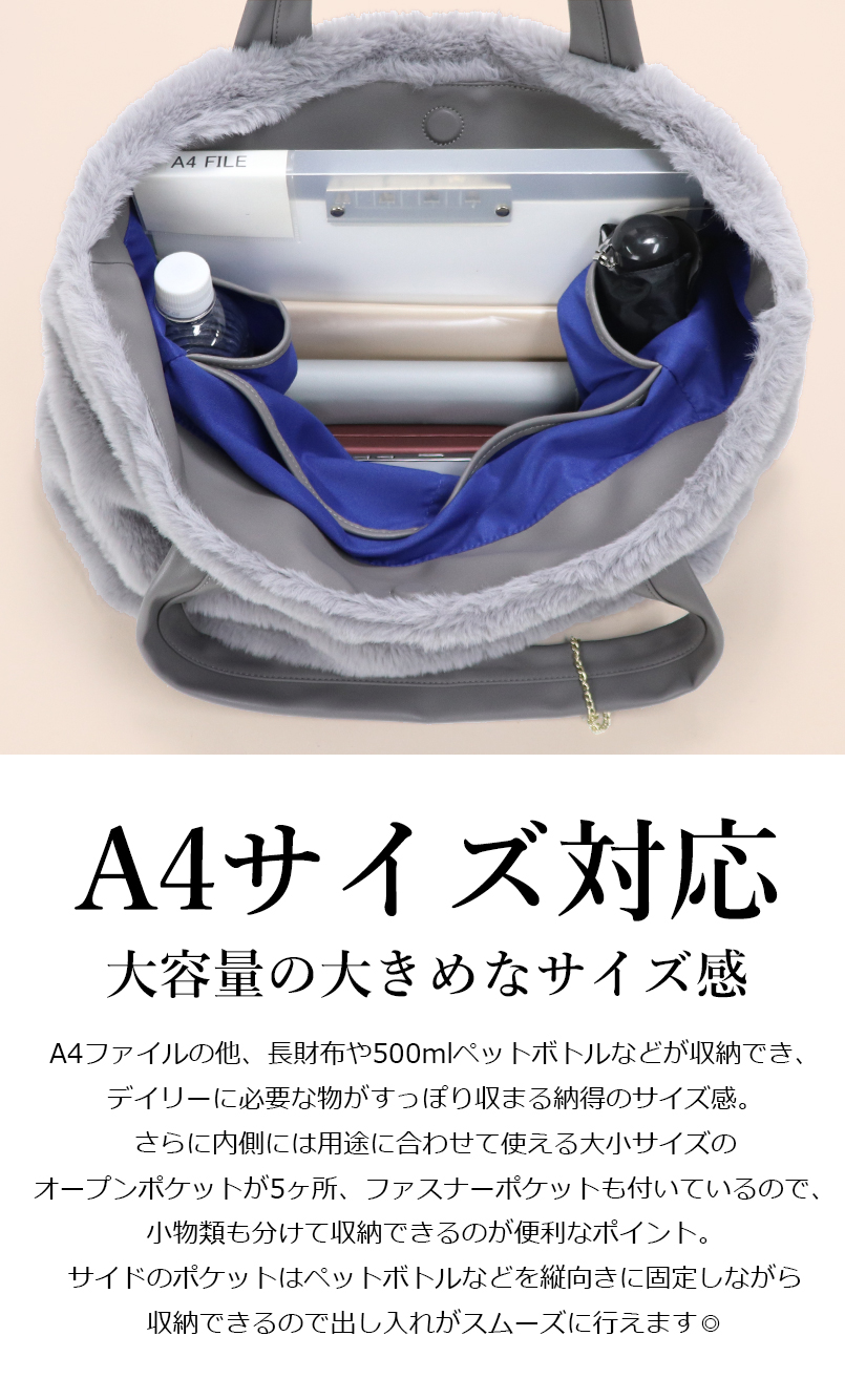 商品名 ファー フェイクファー ふわふわ もこもこ トートバッグ トート レディース 大きめ BAG A4 A4サイズ対応 秋 冬 秋冬 ファーバッグ 大容量 収納力 無地 旅行 ママバッグ マザーズバッグ