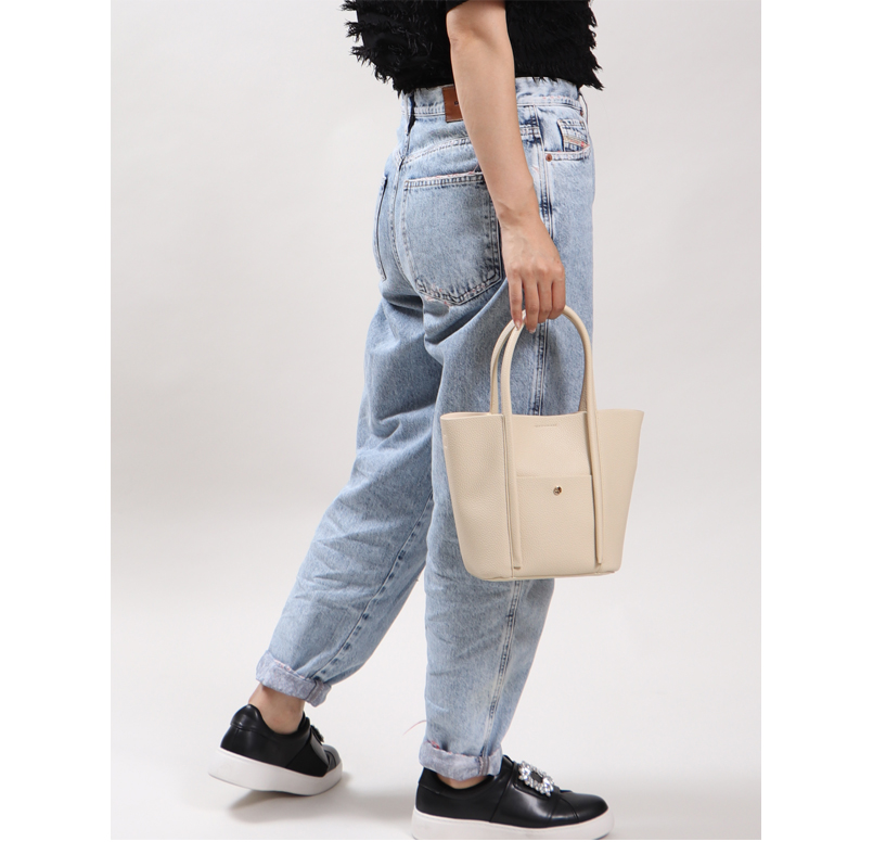 フロントポケットのゴールドスナップヘッドがワンポイントになったトートバッグ。