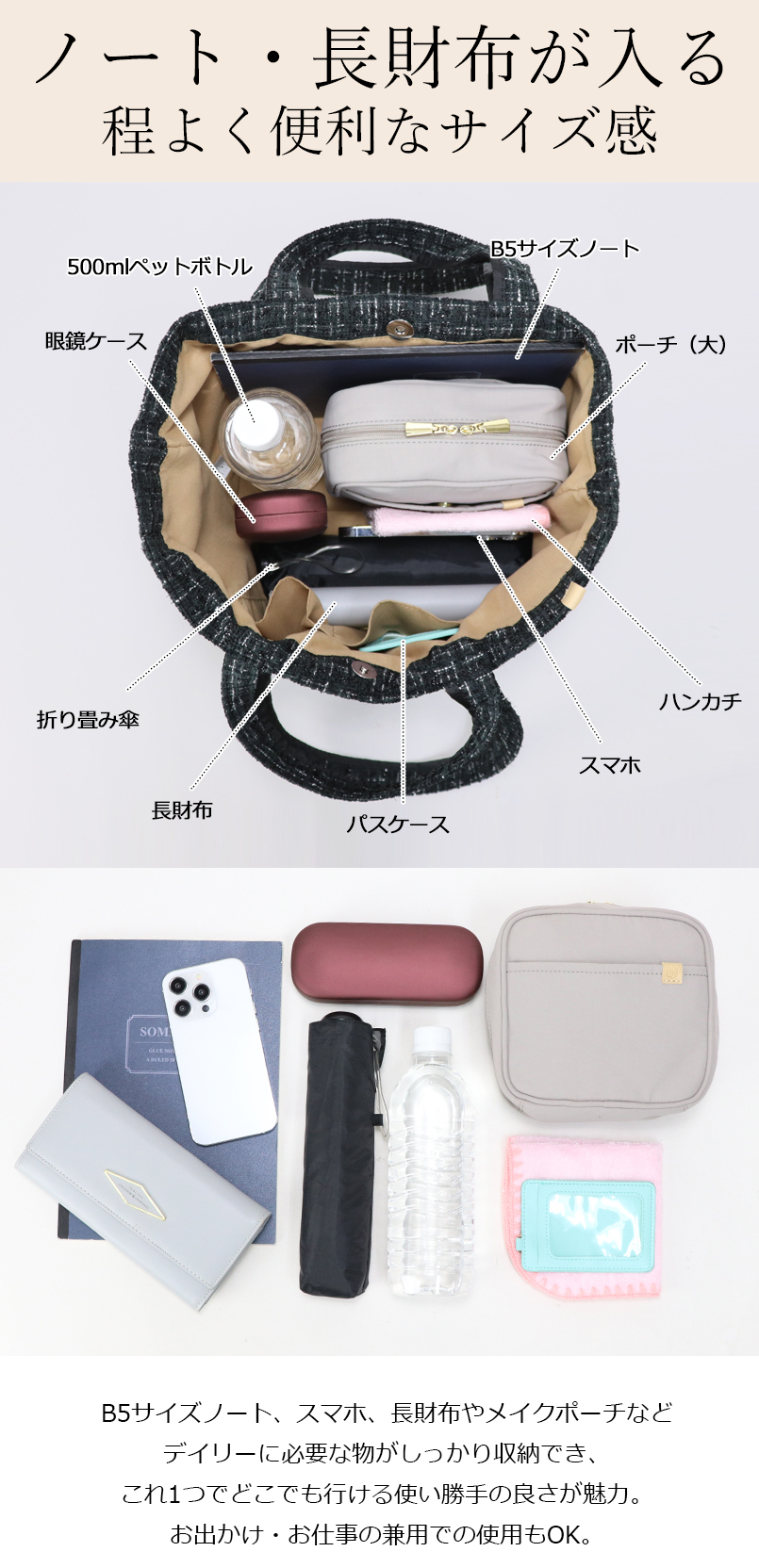 長さの違う2種類の持ち手付きなので、お好みで手持ち・肩掛けのどちらのスタイルもお楽しみ頂ける嬉しい2WAYデザイン。