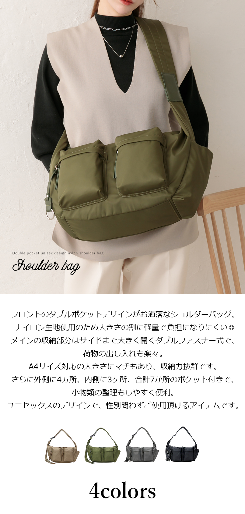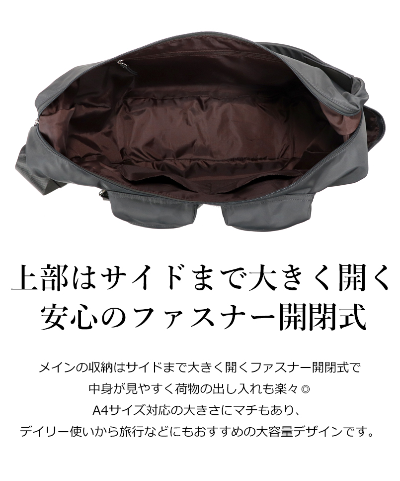 商品名 ショルダーバッグ A4 A4サイズ対応 斜めがけ レディース 女性 バッグ 大人 大きめ 大容量 収納力 旅行 軽量 カジュアル ユニセックス マニッシュ メンズライク ママバッグ 肩掛け