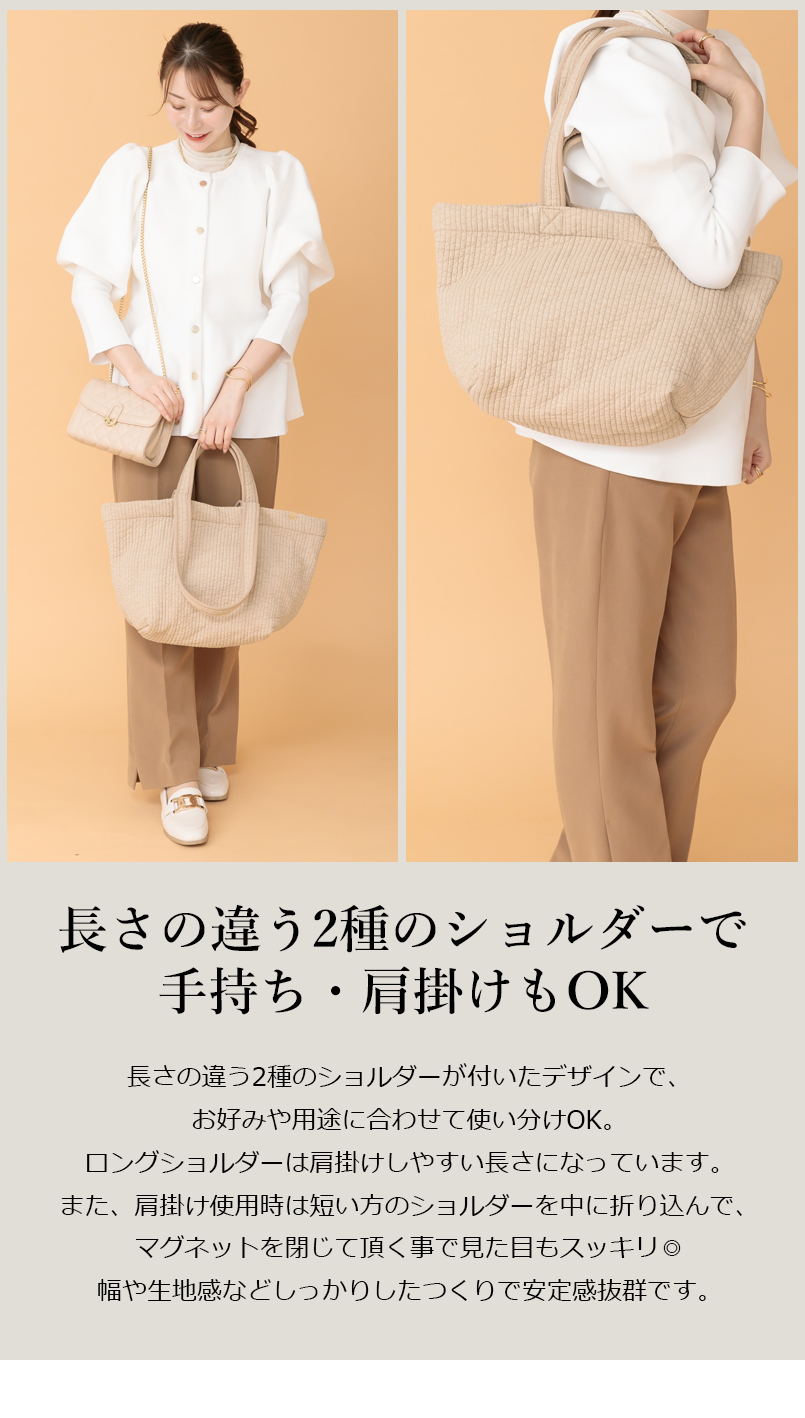 長さの違う2種のショルダーが付いているので肩掛けもしやすく、2wayで使えるデザインもポイント。