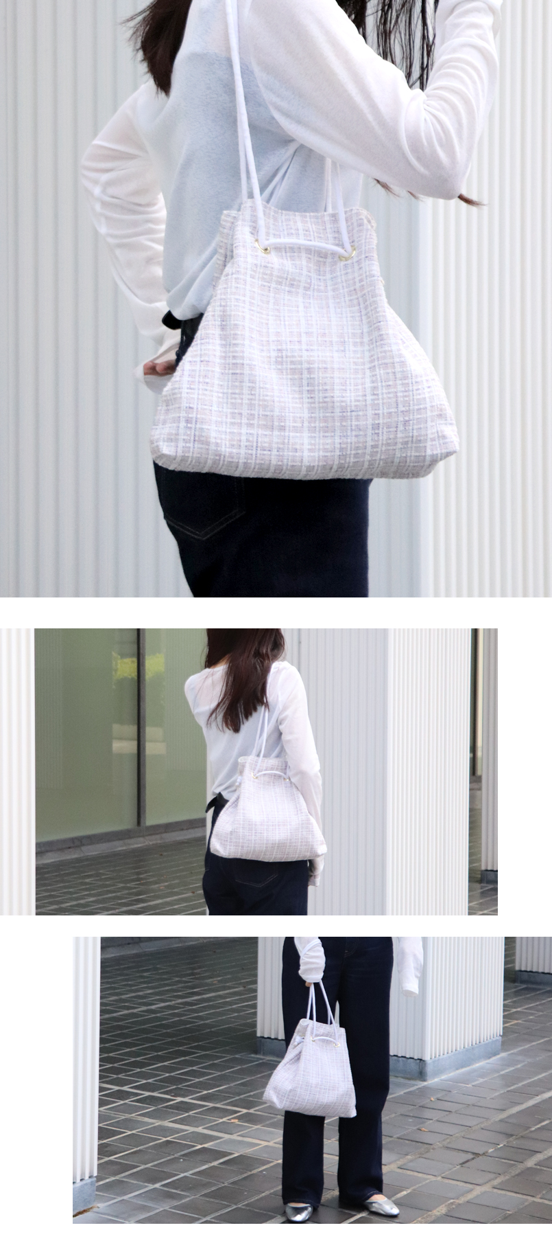 様々なカラーの糸を織り込んで作られたツイード生地で仕立てた巾着ショルダーバッグ。